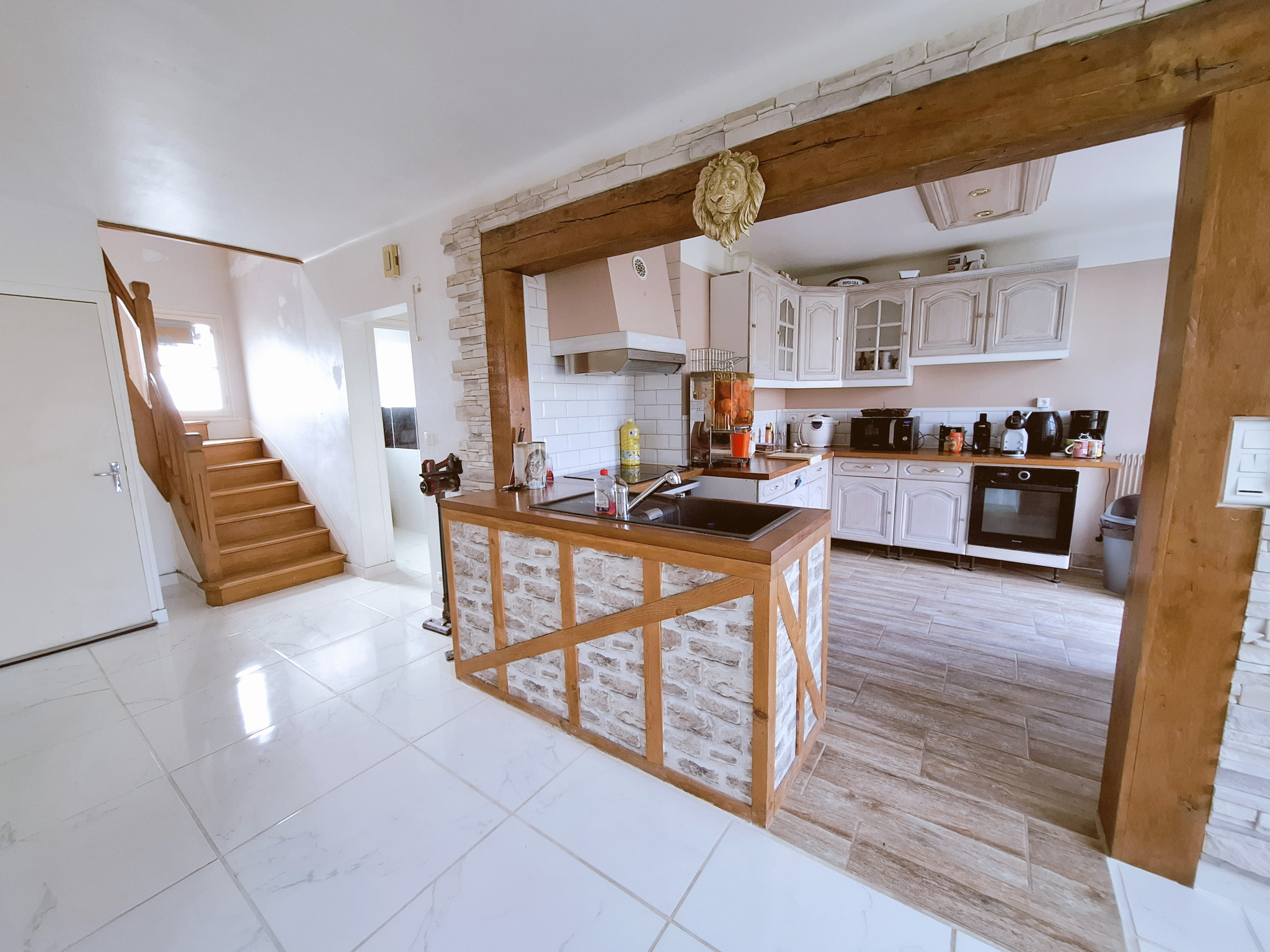 Idéale pour une famille, elle séduit par ses volumes généreux, ses prestations modernes et son cadre paisible avec vue imprenable sur les collines boisées et les champs. Dès l'entrée, vous serez accueilli par un dégagement avec placards menant à un salon/séjour traversant, baigné de lumière grâce à ses portes-fenêtres, et agrémenté d'un insert à bois, parfait pour des soirées chaleureuses. La cuisine, entièrement aménagée et équipée, offre un espace fonctionnel et convivial.